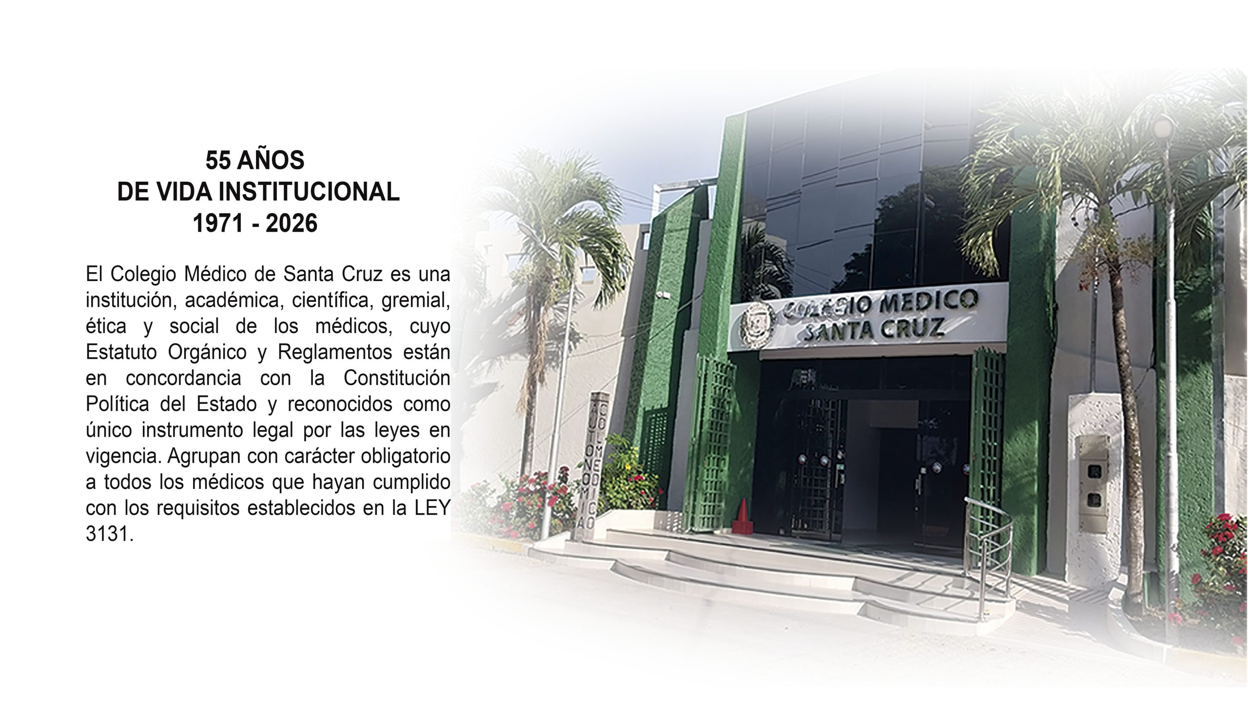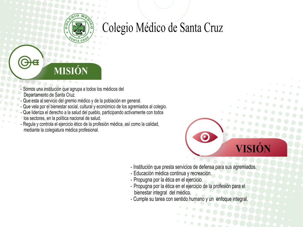 El Colegio Médico de Santa Cruz, nació a la vida institucional el 1 de octubre de 1971, con el objetivo de promover el mejoramiento cultural del médico y el perfeccionamiento del ejercicio profesional, además de velar por el prestigio y la dignidad de la profesión médica.